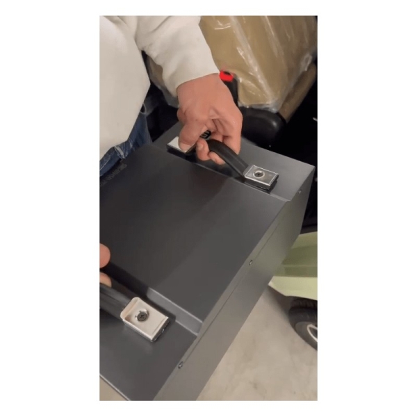 Der herausnehmbare Lithium-Akku (60V/45Ah)des E-Kabinenroller erlaubt eine Reichweite bis zu 60 km. Alternativ können Sie unter der Rückbank zwei herausnehmbare Lithium-Akkus platzieren. Dann erhöht sich die Reichweite auf 120 km. Ein Lithium-Akku wiegt ca. 12 kg. Durch die zwei Tragegriffe können Sie den Akku bequem in Ihre Wohnung tragen und dort aufladen. Alternativ können Sie den Akku auch im Fahrzeug aufladen. Durch das 10Ah Schnellladegerät können Sie einen Lithium-Akku innerhalb von 4- 5 Stunden komplett aufladen. Die hydraulische Scheibenbremsenanlage vorne und hinten sorgt für ausgezeichnete Bremswirkung und kurze Bremswege. Zusätzlich verfügt das Fahrzeug über eine Handbremse. Der Digitaltacho am Lenker informiert Sie über die Geschwindigkeit und die aktuelle Akkuladung. Zusätzlich ist eine Rückfahrkamera verbaut um Ihnen das Einparken zu erleichtern.