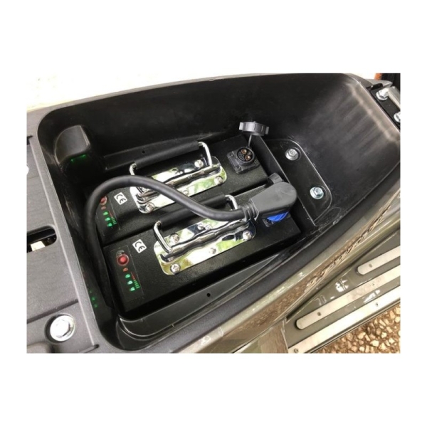 Angetrieben wird der Elektromotor durch zwei herausnehmbare Lithium-Ionen-Akkus, die - je nach Fahrstil - eine Reichweite von bis zu 100 km sowie ca. 1000 Ladezyklen erlaubt. Wird beispielsweise alle 4 Tage aufgeladen, vergeht ein rundes Jahrzehnt, bis der Akku letztlich ausgetauscht werden muss. Der herausnehmbare Akku besitzt einen Tragegriff, was das Aufladen erheblich erleichtert und flexibel gestaltet. So müssen Sie mit dem "Classico" nicht zwingend an einer E-Ladesäule halten, sondern entnehmen schlichtweg den etwa 9 kg schweren Lithium-Ionen-Akku (72V/20Ah Akku) und laden ihn für 2 bis 4 Stunden an einer gewöhnliche Steckdose, sei es zu Hause, im Büro oder im Urlaubshotel. Das dafür nötige Ladegerät können Sie im integrierten und abschließbaren Staufach des E-Rollers überallhin mitführen.
