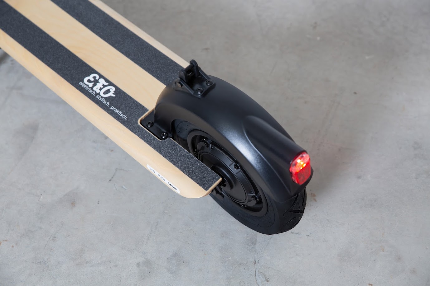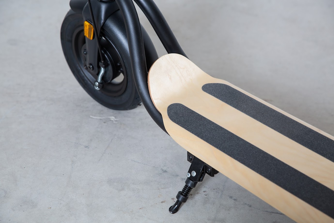 Durch den einfachen Klappmechanismus und die praktische integrierte Einhängefunktion lässt sich der E-Scooter Platzsparend zum transportieren und verstauen zusammenklappen. An der Gabel zum Vorderrad sind die vorgeschriebenen seitlichen Rückstrahler montiert. Sehr auffallend ist das stylische Trittbrett aus Holz. Die außergewöhnliche und einzigartige Form gelingt nur mit einer ausgezeichneten Holzauswahl aus Kanada. Dank der rutschhemmenden Oberfläche findest Du stets guten Halt.