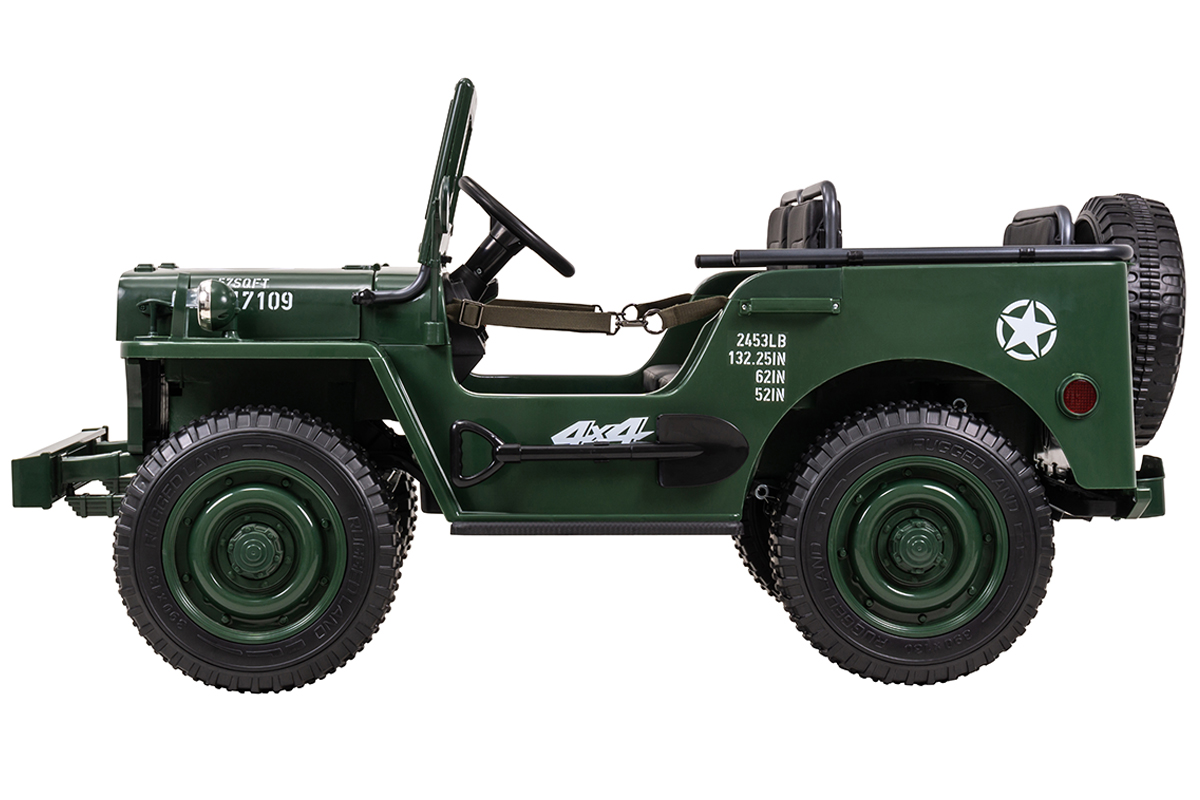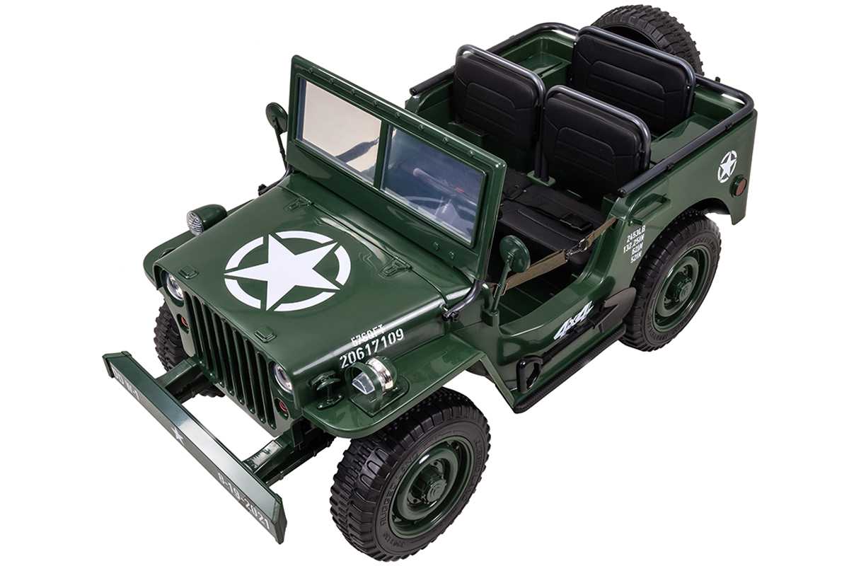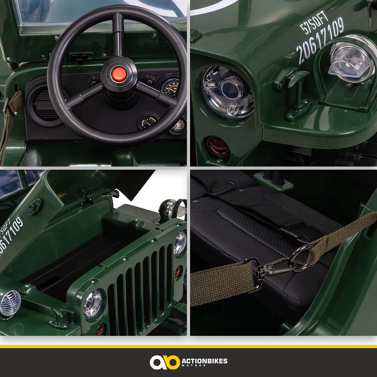 Jeep Willys Kinder-Elektroauto, 3 Sitze und 3 Gurte, Schaufel, Ersatzrad, Federung, Allrad 4x4, LEDs