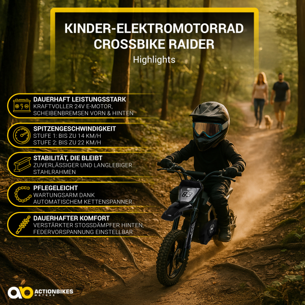 Maximale Sicherheitsstandards, Scheibenbremsen vorn & hinten, Not-Aus, Motorabschaltung beim Bremsen, kindersicherer Geschwindigkeitsstufenschalter, kraftvoller 24V E-Motor, 22 km/h Spitzengeschwindigkeit, robust & komfortabel, langlebiger Stahlrahmen |