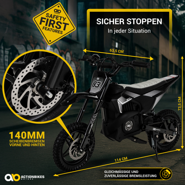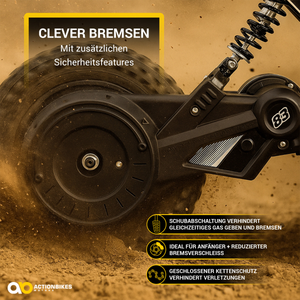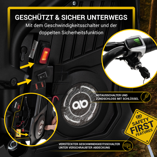Scheibenbremsen vorne und hinten, Motorabschaltung beim Bremsen, kindersicherer 2-Stufen-Geschwindigkeitsschalter, seitlicher Notausschalter, Zündschloss mit Schlüssel, rutschfeste Griffe & Pedale, geschlossener Kettenschutz, rutschfeste Sitzbank |
