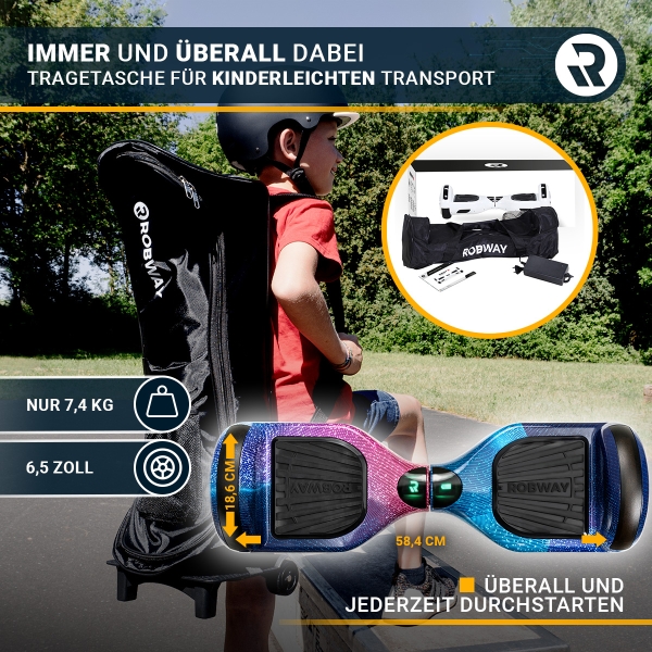 Sie haben bereits eine Runde in Ihrem Innenhof gedreht? Oder Ihre Kids testen gerade das Robway Hoverboard auf der Terrasse? Wie gut, dass zum Lieferumfang auch eine praktische Tasche dazugehört.