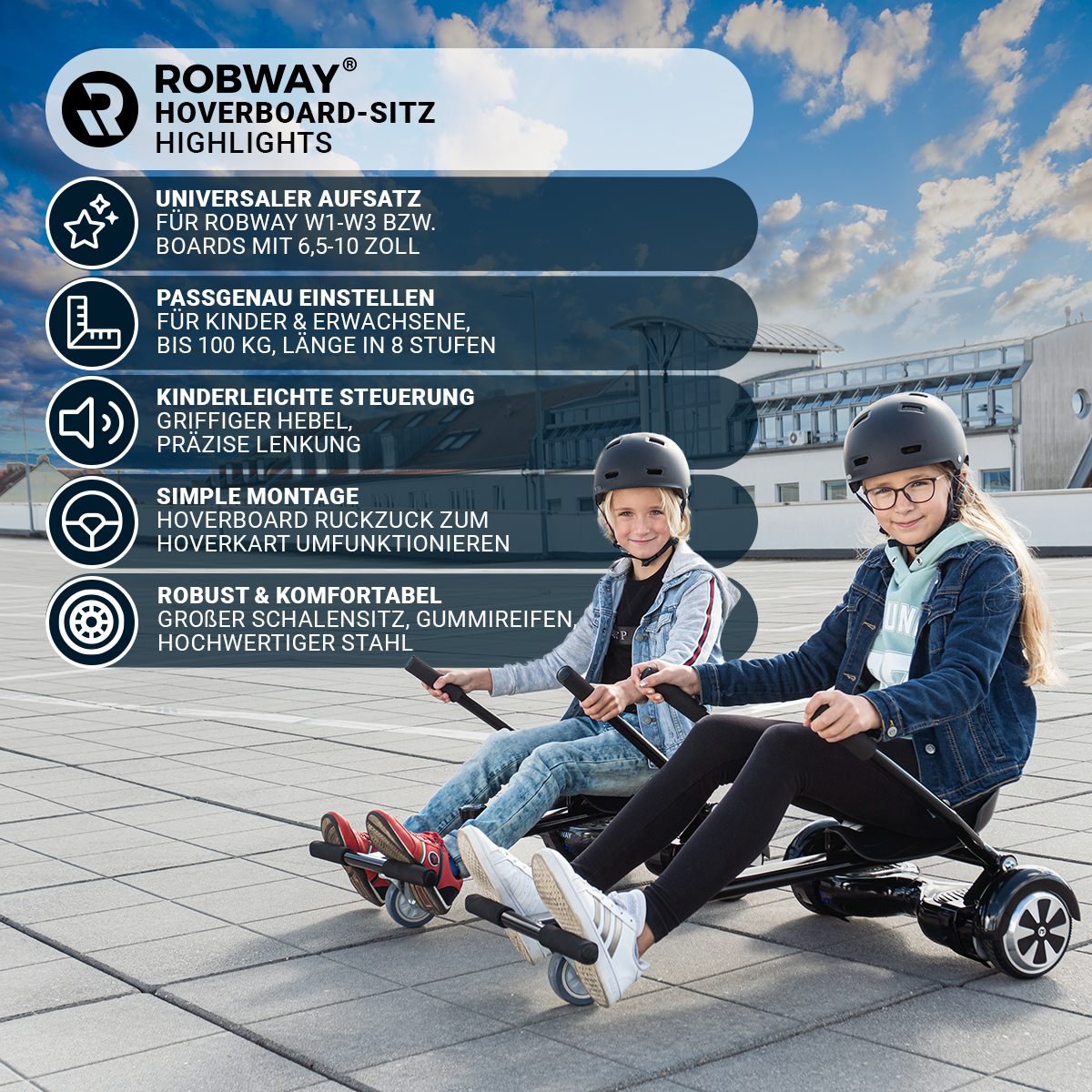Sie lieben es, mit Ihrem Hoverboard förmlich über den Boden zu fliegen? Dann ist der Robway Hoverboard-Sitz perfekt für Sie. Damit erfreuen Sie sich an purem Fahrspaß. Der Unterschied? Sie sitzen bequem im Schalensitz und brauchen sich nicht mehr auf das Halten des Gleichgewichts zu konzentrieren.