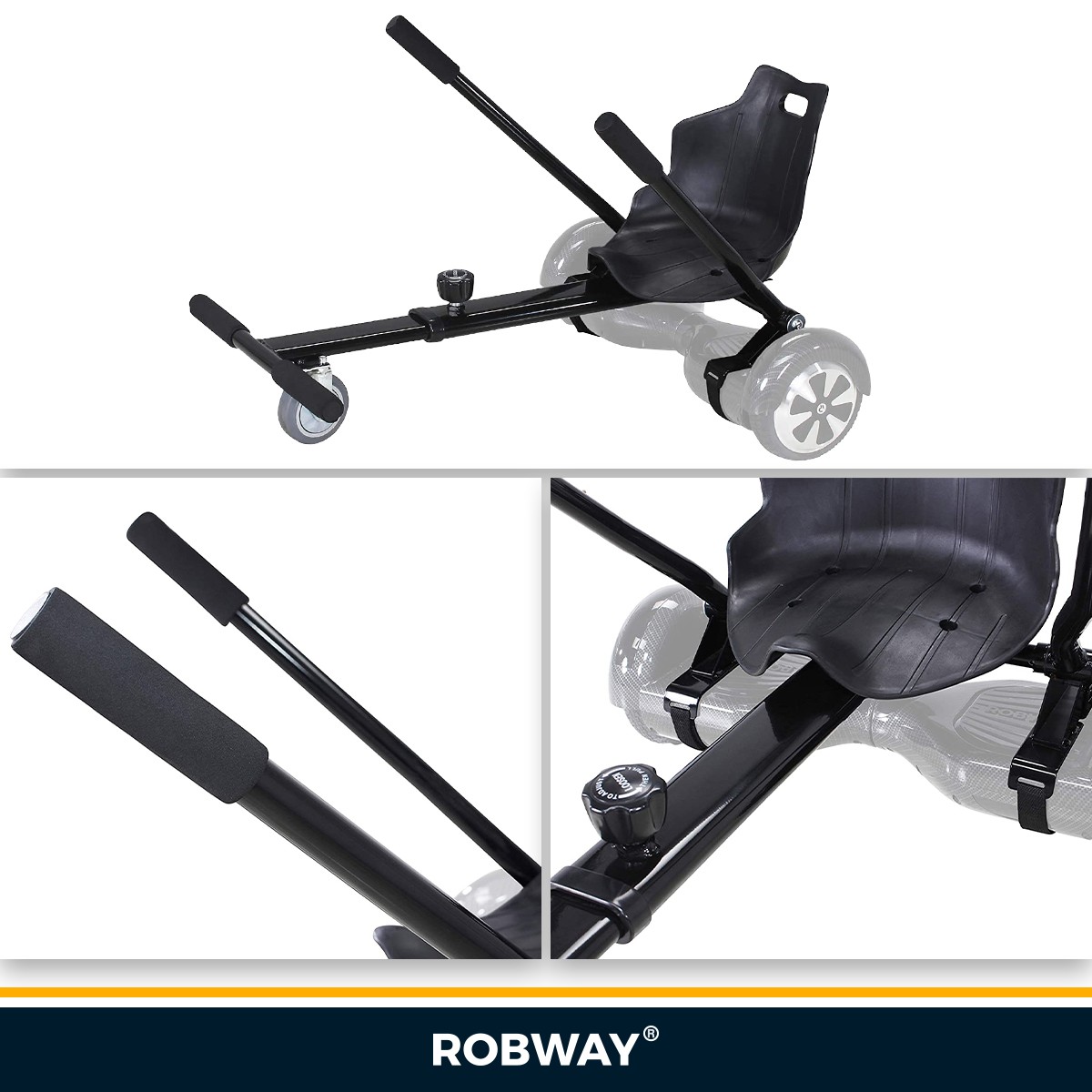 Ein hochwertiger Gummireifen sorgt für ein rundes Gesamtbild. Schwarz oder Weiß? Sie entscheiden, welche Farbe Ihr Herz erobert. Der Hoverseat von Robway ist die perfekte Erweiterung für unglaublichen Fahrspaß!