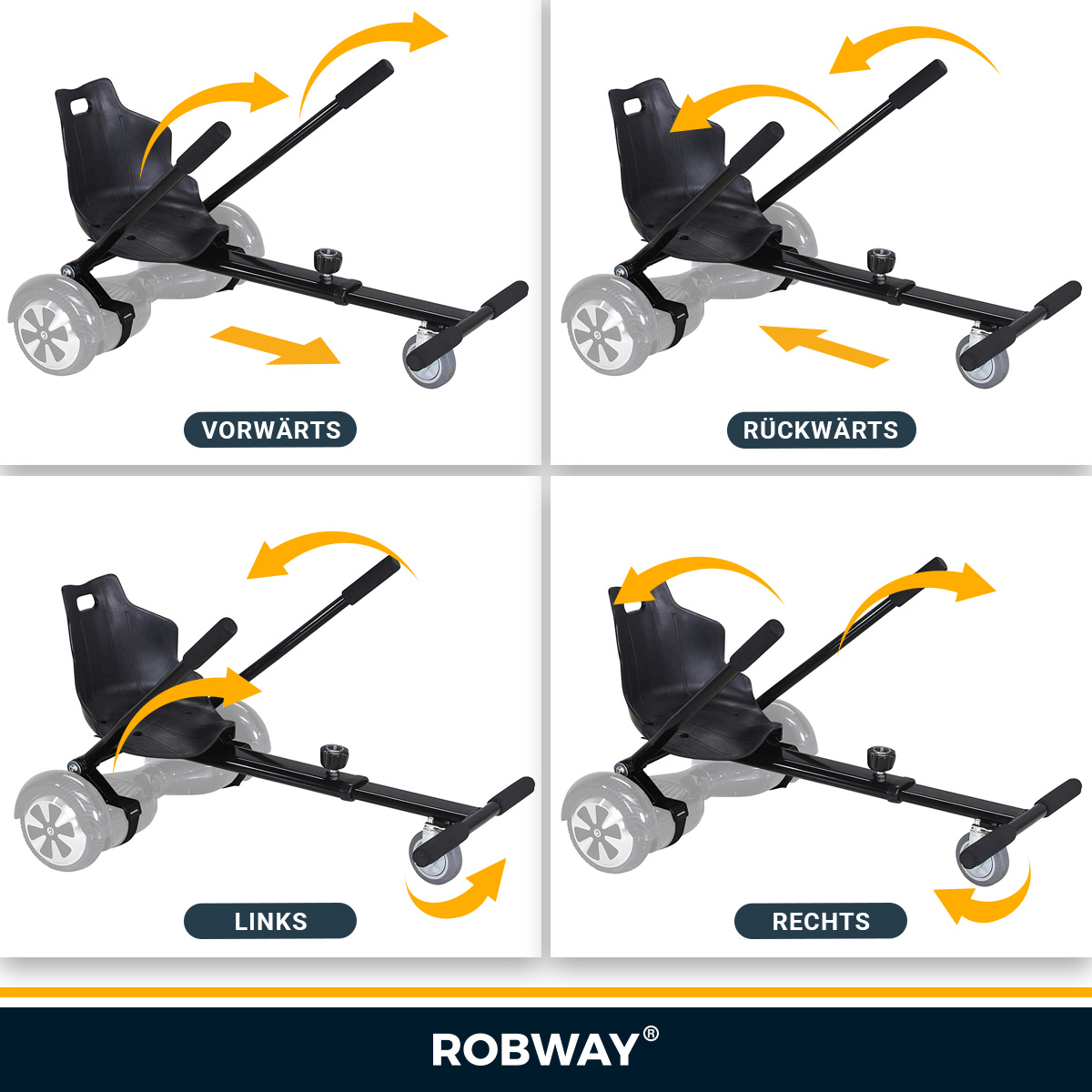 Mit voller Geschwindigkeit über die Zielgerade oder flott um die Kurve: Mit dem Robway Hoverboard-Sitz kriegen Sie alles hin. Die tief liegende Position sorgt dabei für ein einzigartiges Fahrgefühl. Die Nähe zum Asphalt lässt einen förmlich schweben.
